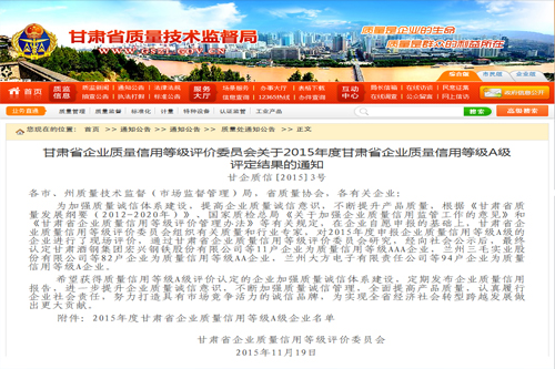 我公司被甘肅省國家稅務局評定為“2015年度納稅信用A級納稅人”