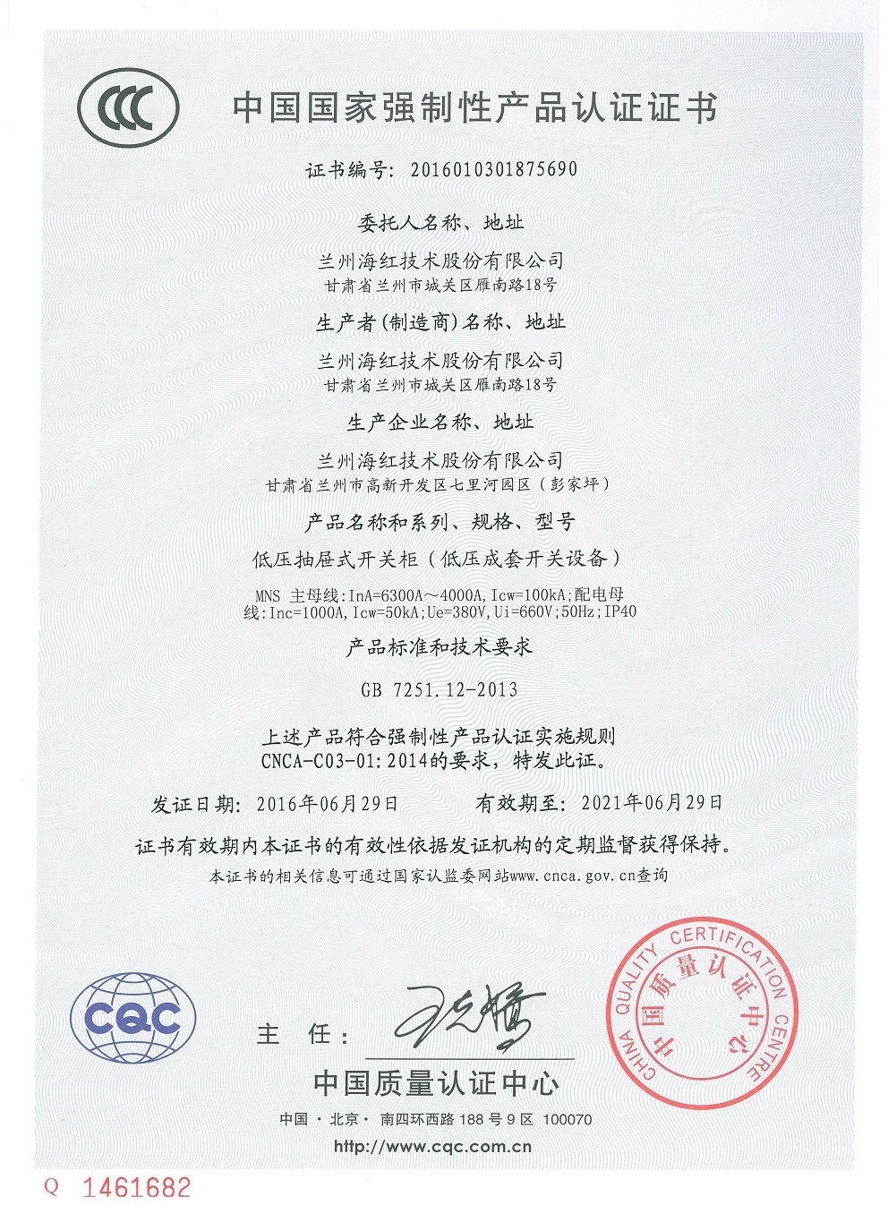 我公司的“低壓抽屜式開關柜(低壓成套開關設備)MNS(6300A-4000A)”通過國家CCC產品認證并取得證書