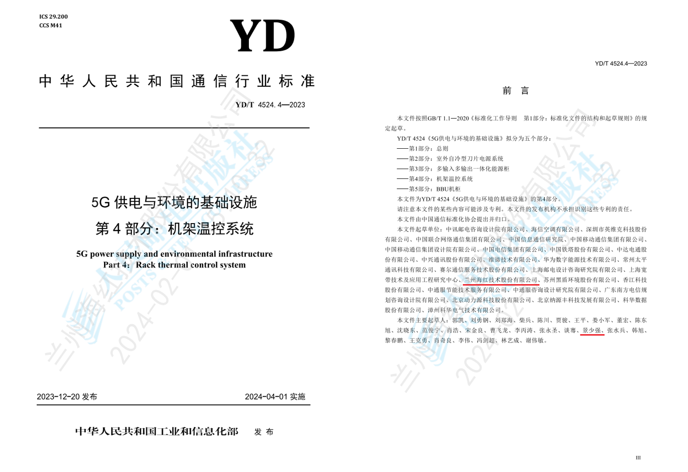 我司參與起草的四項(xiàng)行業(yè)標(biāo)準(zhǔn)《5G供電與環(huán)境的基礎(chǔ)設(shè)施 第4部分:機(jī)架溫控系統(tǒng)》(YD/T 4524.4-2023)、《信息通信用末端母線配電系統(tǒng) 第1部分:交流系統(tǒng)》(YD/T 4...