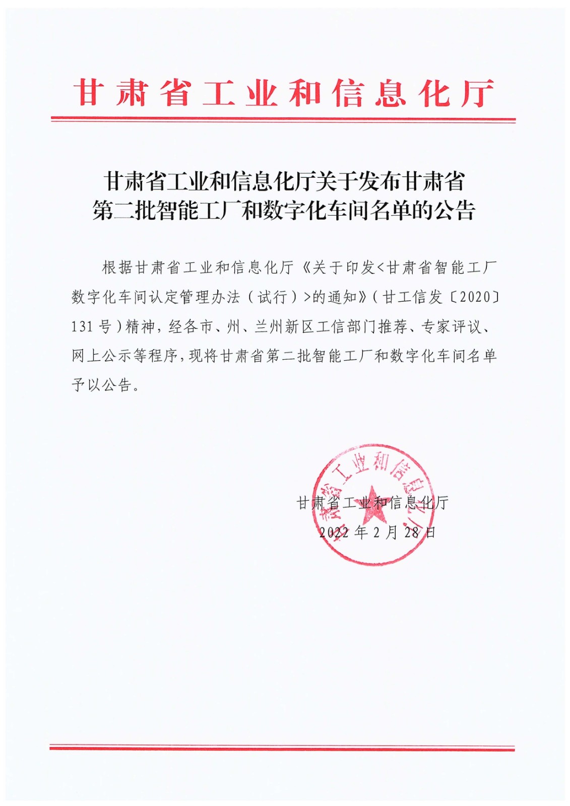 甘肅省工業(yè)和信息化廳發(fā)布甘肅省第二批數(shù)字化車間名單公告,我司鈑金車間被認(rèn)定為甘肅省第二批“數(shù)字化車間”。 近年來(lái),公司積極響應(yīng)政府“綠色化、信息化、智能化”(三化)改...