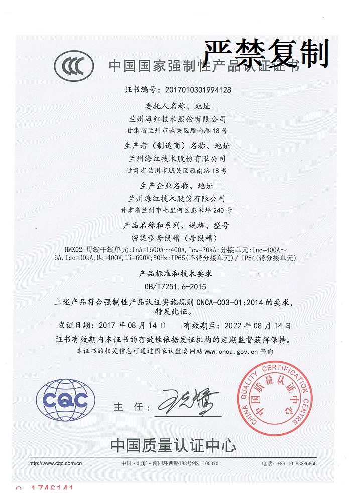我公司的“密集型母線槽 (HMX01型)與密集型母線槽 (HMX02型)”產(chǎn)品通過中國質(zhì)量認(rèn)證中心的CCC認(rèn)證并取得證書。至此,我公司共取得14個產(chǎn)品的CCC認(rèn)證證書。