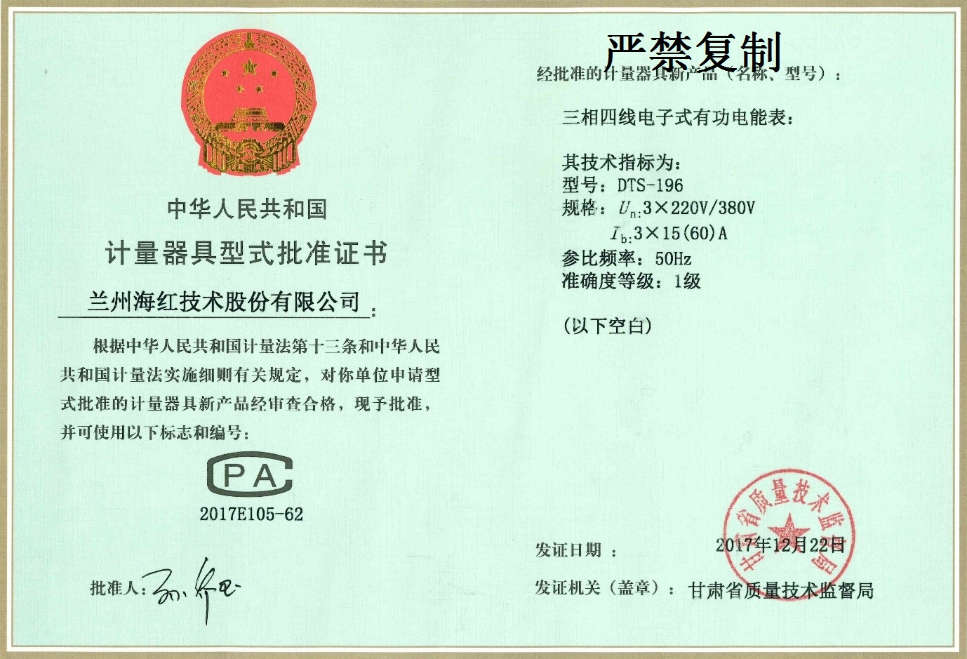 我公司生產(chǎn)制造的“三相四線電子式有功電能表”產(chǎn)品,經(jīng)甘肅省質(zhì)量技術(shù)監(jiān)督局的現(xiàn)場(chǎng)審核,生產(chǎn)條件、產(chǎn)品質(zhì)量和計(jì)量法制管理考核合格,通過CMC認(rèn)證,取得制造計(jì)量器具許可證。