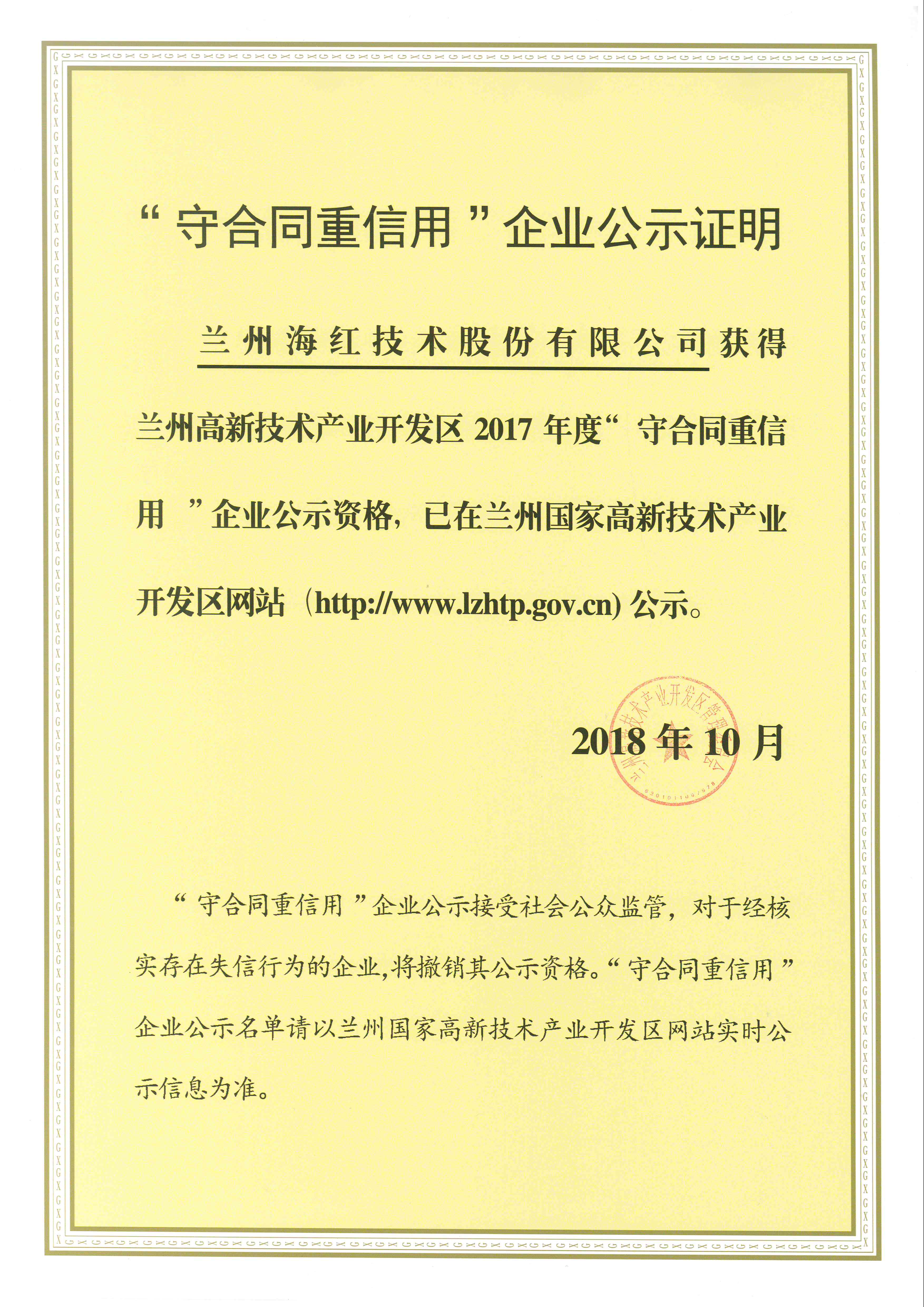 我公司榮獲2017年度蘭州市/高新區(qū)“守合同、 重信用”企業(yè)榮譽稱號 By 海紅技術(shù) 2018-11-29 00:00:00 0次 我公司被蘭州市工商行政管理局和蘭州市高新技術(shù)產(chǎn)業(yè)開發(fā)區(qū)管理委員評定為2017年度“守合同、重信用”企業(yè)。 上一篇:我司與蘭州交通大學(xué)新能源與動力工程學(xué)院共建“新能源汽車充電技術(shù)聯(lián)合研究中心”暨設(shè)立“海紅獎學(xué)金” 下一篇:我公司又取得二項實用新型專利