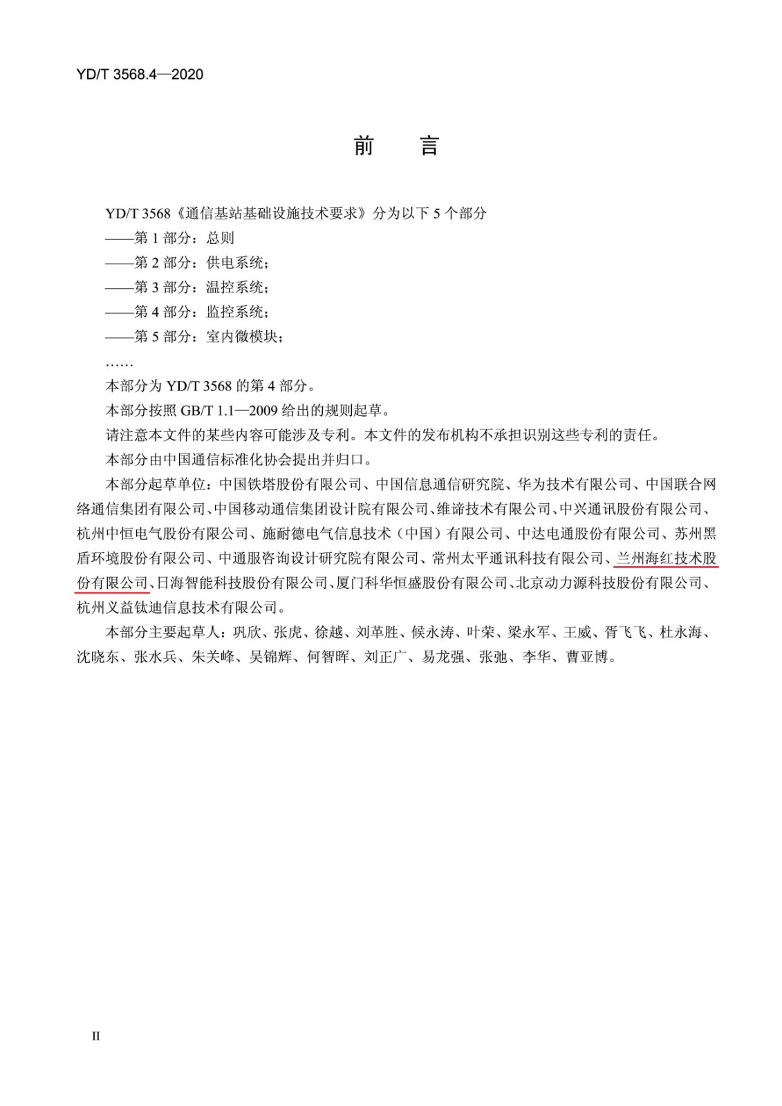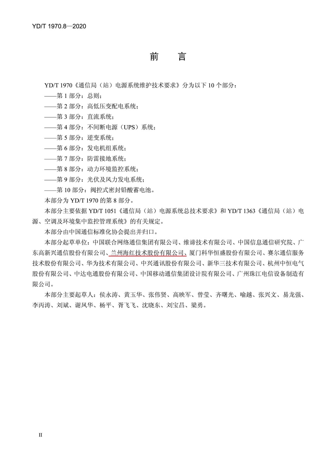 我司參與起草的《通信局(站)電源系統(tǒng)維護(hù)技術(shù)要求 第 8 部分:動(dòng)力環(huán)境監(jiān)控系統(tǒng)》(YD/T 1970.8-2020)、《通信基站基礎(chǔ)設(shè)施技術(shù)要求第 4 部分:監(jiān)控系統(tǒng)》(YD/T 3568.4-2020)、《通信基站梯次利用車用動(dòng)力電池的技術(shù)要求與試驗(yàn)方法第 1 部分:磷酸鐵鋰電池》(YD/T 3768.1-2020)、《數(shù)據(jù)中心用市電加保障電源的兩路供電系統(tǒng)技術(shù)要求》(YDT3767-2020)四項(xiàng)行業(yè)標(biāo)準(zhǔn)經(jīng)中華人民共和國(guó)工業(yè)和信息化部批準(zhǔn)發(fā)布,前兩項(xiàng)已于2020年07月01日實(shí)施,后兩項(xiàng)已于2020年10月01日實(shí)施。以上標(biāo)準(zhǔn)是繼《通信電源和機(jī)房環(huán)境節(jié)能技術(shù)指南第5部分:氣流組織》、《網(wǎng)絡(luò)機(jī)柜用分布式電源系統(tǒng)》、《通信電源和機(jī)房環(huán)境節(jié)能技術(shù)指南 第2部分:應(yīng)用條件》、《通信用240V直流供電系統(tǒng)使用技術(shù)要求》、《通信局(站)電源系統(tǒng)總技術(shù)要求》、《通信用240V/336V直流配電單元》、《通信機(jī)房用光纖槽道》、《通信基站基礎(chǔ)設(shè)施技術(shù)要求 第3部分:溫控系統(tǒng)》、《通信基站基礎(chǔ)設(shè)施技術(shù)要求 第1部分:總則》、《通信基站基礎(chǔ)設(shè)施技術(shù)要求 第2部分:供電系統(tǒng)》十項(xiàng)標(biāo)準(zhǔn)之后,由我司參與起草正式出版的第11項(xiàng)、第12項(xiàng)、第13項(xiàng)、第14項(xiàng)行業(yè)標(biāo)準(zhǔn)。