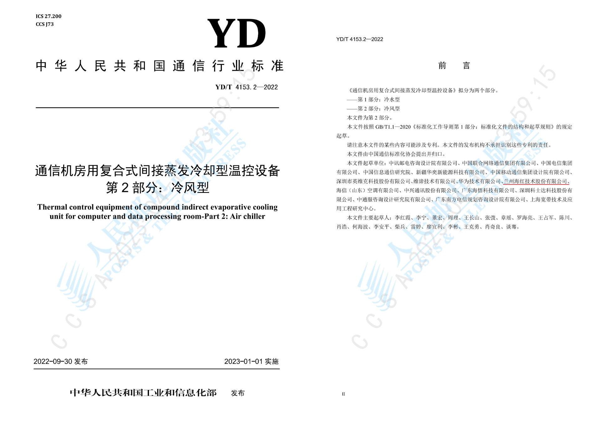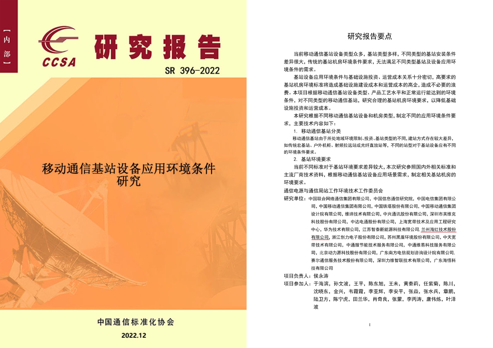 我司參與起草的兩項(xiàng)行業(yè)標(biāo)準(zhǔn)《通信機(jī)房用復(fù)合式間接蒸發(fā)冷卻型溫控設(shè)備 第1部分:冷水型》(YD/T 4153.1-2022)及《通信機(jī)房用復(fù)合式間接蒸發(fā)冷卻型溫控設(shè)備 第2部分:冷風(fēng)型》(YD/T 4153.1-2022)經(jīng)中華人民共和國(guó)工業(yè)和信息化部批準(zhǔn)發(fā)布,已于2023年01月01日實(shí)施。同時(shí),我司參與的兩項(xiàng)研究課題也于近日出版了研究報(bào)告,分別為《雙路直流供配電系統(tǒng)應(yīng)用研究》及《移動(dòng)通信基站設(shè)備應(yīng)用環(huán)境條件研究》。 至此我司共參與起草、修訂行業(yè)標(biāo)準(zhǔn)19項(xiàng)、研究課題2項(xiàng),詳細(xì)情況如下: