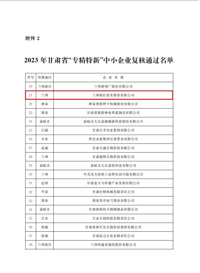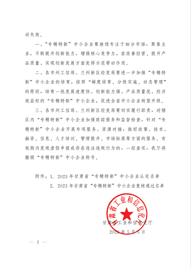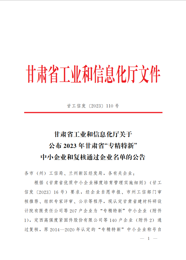 近日,甘肅省工信廳發(fā)布了《關(guān)于公布2023年甘肅省“專精特新”中小企業(yè)和復(fù)核通過企業(yè)名單的公告》(甘工信發(fā)〔2023〕110號(hào)),我司通過2023年甘肅省“專精特新”中小企業(yè)復(fù)核。