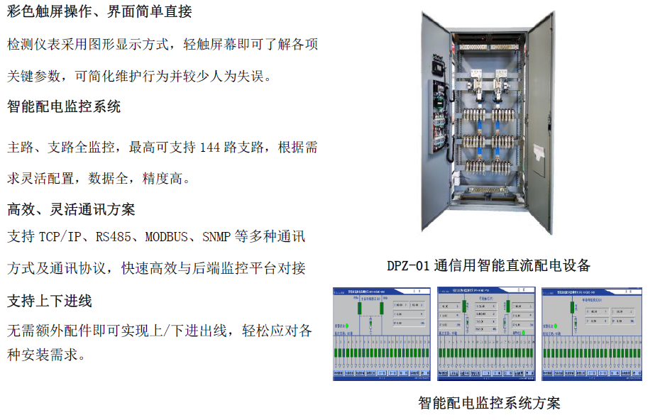 DPZ-01通信用智能直流配電設(shè)備主要是對(duì)直流電能進(jìn)行分配、監(jiān)控、保護(hù),柜內(nèi)配置智能檢測儀表,滿足配電、監(jiān)控、測量、保護(hù)、告警等功能。