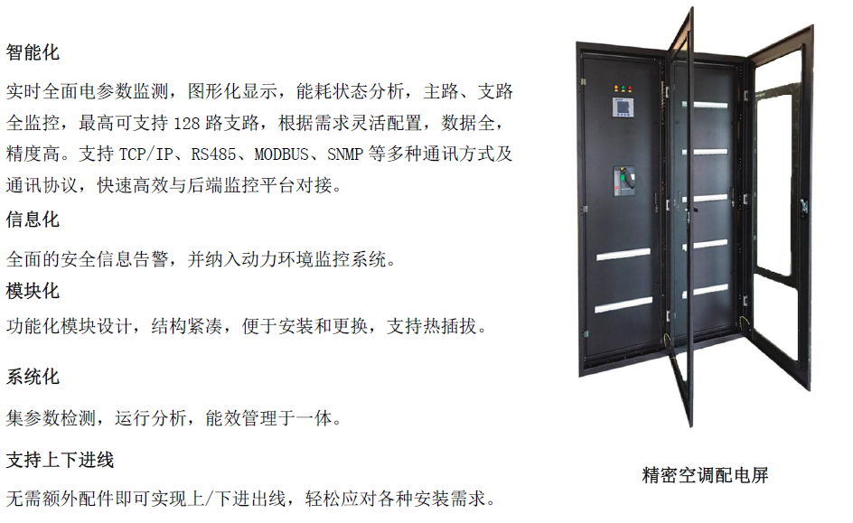 精密空調(diào)配電屏是一款針對(duì)數(shù)據(jù)中心機(jī)房內(nèi)的制冷精密空調(diào)定制化產(chǎn)品,綜合采集所有電氣數(shù)據(jù),實(shí)時(shí)反映電能能耗,分析判斷設(shè)備運(yùn)行狀態(tài),對(duì)整個(gè)配電系統(tǒng)安全運(yùn)行質(zhì)量的有效管理,為實(shí)現(xiàn)全方位綠色數(shù)據(jù)中心機(jī)房提供可靠保障,避免數(shù)據(jù)中心機(jī)房設(shè)備溫度升高會(huì)對(duì)系統(tǒng)運(yùn)行造成嚴(yán)重后果。