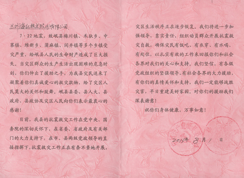 一封來(lái)自定西地震災(zāi)區(qū)的感謝信