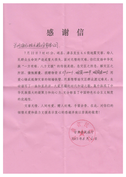 8月初,蘭州海紅技術(shù)股份有限公司收到了來(lái)自甘肅省民政廳、岷縣人民政府的感謝信。